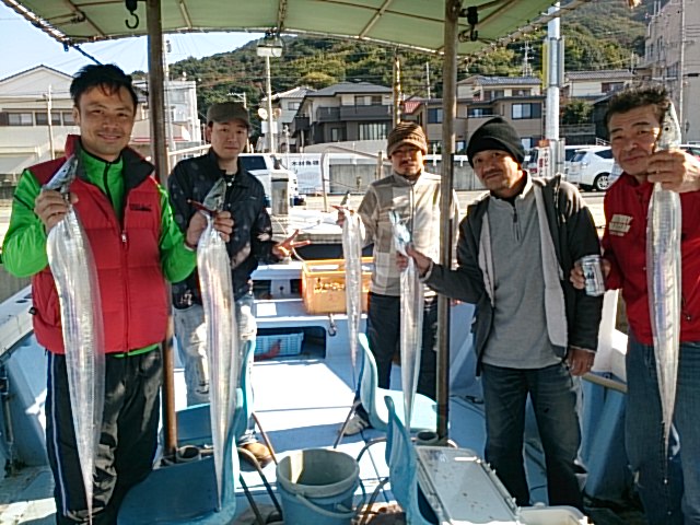 今日も絶好の釣り日よりでした。 数少ないですが、良型のタチウオと五目釣り両方楽しんでもらいました。 11月21日(金) 晴れ 大潮 波なし 海水温19℃ 釣り人 吉村様、後藤様、岡崎様、前田様、藤井様、嶋田様 釣果 タチウオ15匹(85センチ~115センチ)/マアジ6匹(27センチ~36センチ)/マサバ2匹(33センチ・40センチ)/マダイ1匹・30センチ/チャリコ2匹(22センチ・23センチ)/キス1匹・16センチ/ウマヅラハギ1匹・25センチ/ガシラ1匹・17センチ 仕掛け タチウオテンヤ 餌 イワシ 仕掛け 胴突き3本針 餌 …
