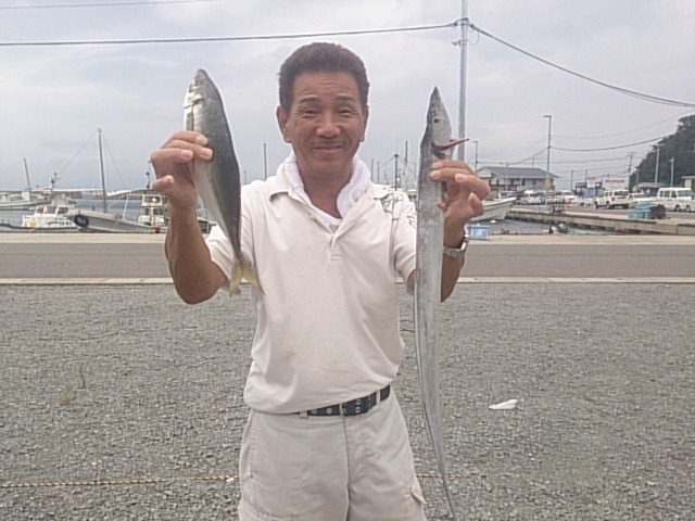 今日も朝から風波あり、大時化でした! そんな中、前半タチウオ狙い、後半ノマセ、五目釣りして遊んでもらいました。 昨日に引き続き、昼まで持ちませんでした(T_T) 8月16日(土) 晴れ 中潮 波なし 海水温25℃ 釣り人 武田御夫婦様、小村様、浜崎様、矢野様、井上様、黒崎様 釣果 マタハ1匹・28センチ(ノマセ)/タチウオ数匹(60センチ〜98センチ)/マアジ数匹/チャリコ1匹・/ガシラ1匹・キス1匹・24センチ/エソ数匹 魚の数数えられませんでした。 仕掛け 胴付き3本針 餌 青イソメ 仕掛け タチウオテンヤ 餌 イワシ 仕掛け ノマセ仕掛け 餌 …