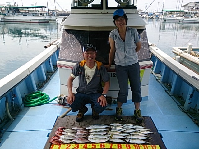 今日は、風波なくとても暑い1日でした。 台風明けで魚の食い心配しましたが、マアジ主に釣れ十分釣れ良い土産になりました(^-^) 7月12日(土)晴れ 大潮 波なし 海水温22℃ 釣り人 武田御夫婦様、浜崎様 釣果 マアジ24匹(22センチ〜37センチ)/マサバ1匹・42センチ/カスゴ1匹・30センチ/チャリコ4匹(17センチ〜19センチ)/ガシラ6匹(15センチ〜20センチ)/イシモチ3匹(23センチ〜25センチ)/キス2匹(19センチ・20センチ) 仕掛け 胴付き3本針 餌 青イソメ 仕掛け 餌 ジグ …