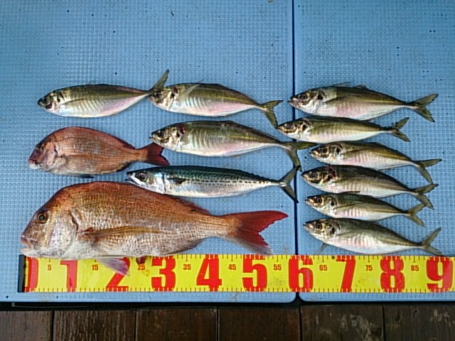今日は、タイカブラ中心に色々夏バテで仕掛けで大物狙いしました。 マダイはタイカブラ、マアジはアオイソメ、ゴマサバはビニールに掛かりました。 良いものばかり釣れて良い土産になりました。 6月11日(水)曇り 大潮 波なし 海水温19℃ 釣り人 木谷様 釣果 マダイ1匹・55センチ[タイカブラ]/マアジ9匹(28センチ〜39センチ)/ゴマサバ1匹・40センチ/マダイ1匹・34センチ 仕掛け 餌 タイカブラ 仕掛け 高仕掛け 餌 ビニール 仕掛け 胴付き2本針 餌 青イソメ …