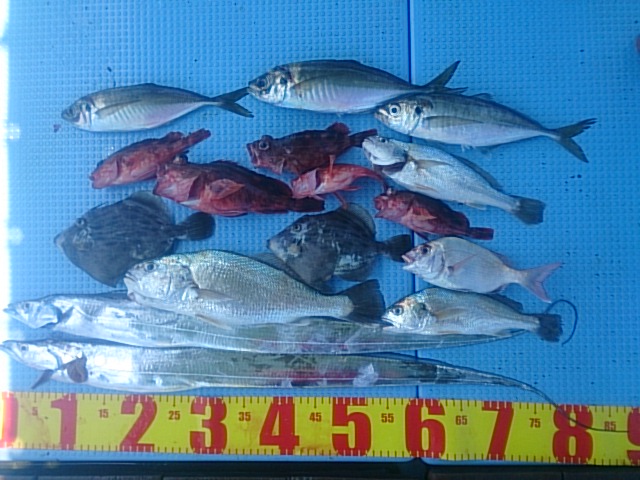 今日は、当船では、知る人ぞ知る有名な何でも来いの合田さんが、転勤先から帰って当船に帰って来てくれました。 今回はノマセ中心にしましたが、本命釣れず、土産に五目釣りして、おかず持って帰ってもらいました。 8月19日(月) 晴れ 中潮 波なし 海水温28℃ 釣り人 竹内様、合田様 釣果 マアジ3匹(28?32?)/ガシラ5匹(18?〜25?)/チャリコ1匹・21?/カワハギ2匹(21?・23?)/イシモチ3匹【ノマセ】(25?〜36?)/タチウオ【ノマセ】2匹(88?・90?) 仕掛け ノマセ仕掛け 餌 活きアジ 仕掛け 胴付き3本針 餌 …