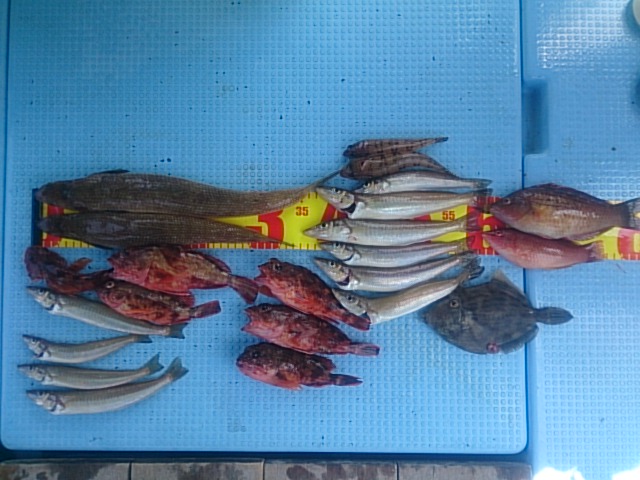 今日も色々しましたが、大物残念でした。 キス良型釣れ何とかおかず出来ました。 8月17日(土) 晴れ 若潮 波なし 海水温28℃ 釣り人 武田御夫婦様、小村様 釣果 キス10匹(17?〜25?)/ガシラ6匹(17?〜20?)/トラギス匹(?〜?)/ベラ2匹(17?〜21?)/エソ2匹(35?・42?) 仕掛け ヒトツテンヤ 餌 海エビ 仕掛け、ノマセ仕掛け 餌 活きアジ 仕掛け・餌 ショートジギング 仕掛け 胴付き3本針 餌 青イソメ 仕掛け タチウオテンヤ 餌 活きアジ 皆さん、暑い中お疲れ様でした。 9月も頑張りましょうね(^_^) 本日は、ありがとうございました。 …