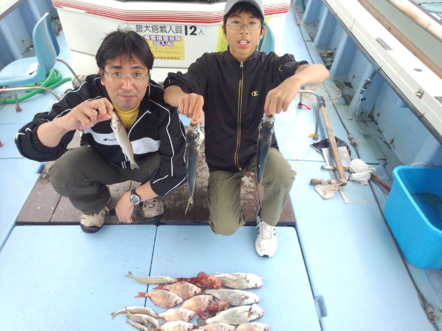 今日も昨日同様どんよりとした1日で暑くなくて良かったです。 昨日より潮流れず苦戦し、なかなか数増やせませんでしたが、何とかおかず出来て良かったです(^_^)ノ 6月2日(日) 曇り 小潮 波なし 海水温19℃ 釣り人 山川親子様 釣果 マアジ2匹(36㎝・37㎝)/ガシラ2匹(16㎝・20㎝)/チャリコ7匹(19㎝~22㎝)/キス4匹(17㎝~24㎝)/トラギス9匹(12㎝~17㎝)/イシモチ3匹(27㎝~30㎝) 仕掛け 胴付き3本針 餌 青イソメ 千都君楽しんでくれましたか? 今日は、数少なかったけど、色々バラエティー豊かに釣れて良かったですね(^_ …