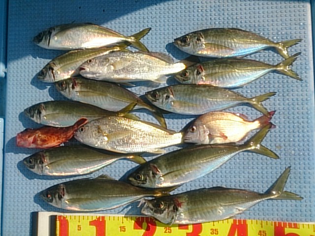 釣果 マアジ11匹(26?〜36?)/チャリコ1匹・20?/ガシラ1匹・17?/イシモチ2匹(27?・30?)