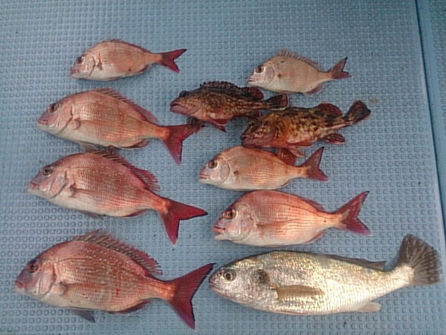 午前便タチウオ食い渋く最悪だったので、午後便では、タチウオやらず五目釣りしましたが波高くアタリ取りづらく苦戦しながらも、何とかチャリコ中心におかず出来ました。