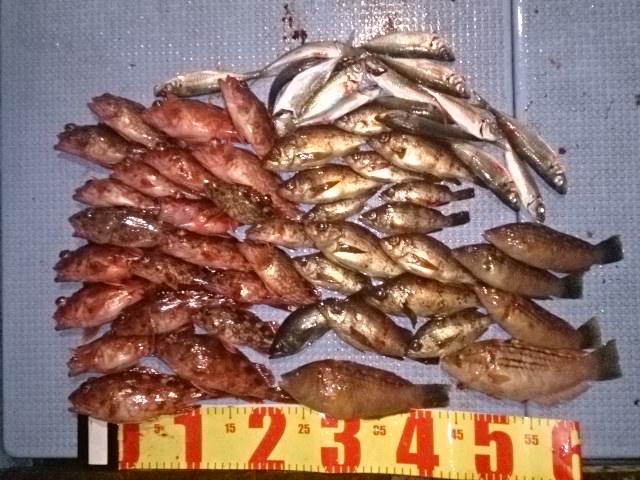 釣果 メバル15匹(14?〜19?)/ガシラ23匹(15?〜21?)/ベラ5匹(19?〜23?)/小アジ15匹
