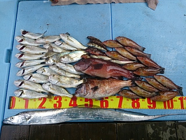 釣果 マダイ1匹・47センチ[ヒトツテンヤ]/コブダイ1匹・46センチ・[ヒトツテンヤ]/タチウオ1匹・121センチ[タイカブラ]/イシモチ21匹(21センチ〜28センチ)/ガシラ2匹(12センチ・20センチ)//キス2匹(19センチ・21センチ)/トラギス3匹(15センチ〜17センチ)/ベラ14匹(19センチ〜21センチ)