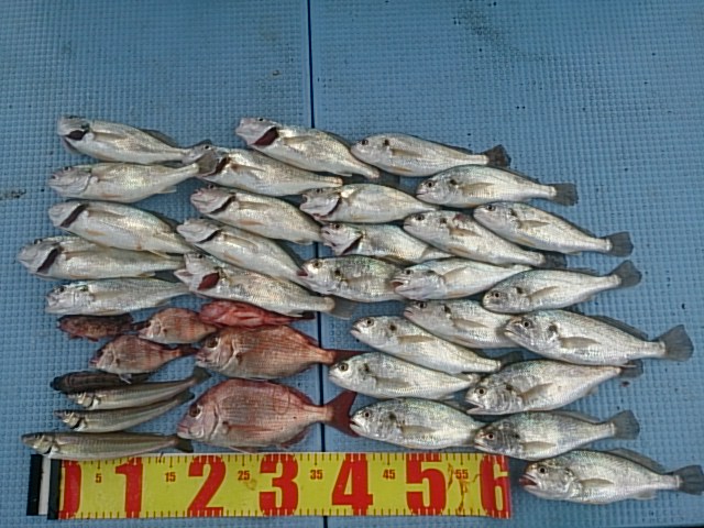 釣果 イシモチ27匹(24センチ〜30センチ)/チャリコ2匹(15センチ・16センチ)/カスゴ2匹(25センチ・27センチ)/ガシラ2匹(15センチ・17センチ)/キス3匹(20センチ〜24センチ)/トラギス1匹・16センチ