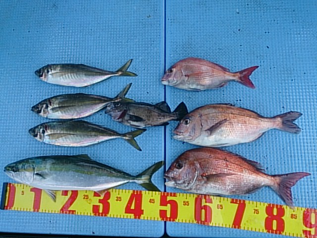 釣果 マダイ匹(38センチ・42センチ)[タイカブラ]/ハマチ1匹・50センチ[タイカブラ]/マダイ1匹・31センチ[高仕掛け]/マアジ3匹(34センチ〜38センチ)/メバル1匹・26センチ[サビキ]