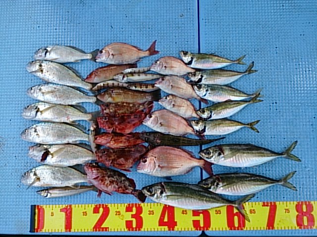 釣果 マアジ8匹(21センチ〜35センチ)/カスゴ1匹・26センチ/チャリコ5匹(17センチ〜23センチ)/ガシラ5匹(17センチ〜21センチ)/イシモチ7匹(22センチ〜28センチ)/キス1匹・20センチ/トラギス5匹(10センチ〜17センチ)/鰐鯒1匹・27センチ/ベラ2匹(18センチ・20センチ)