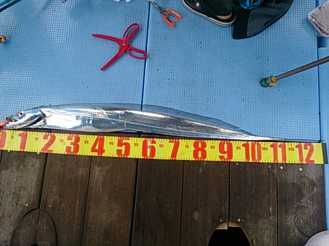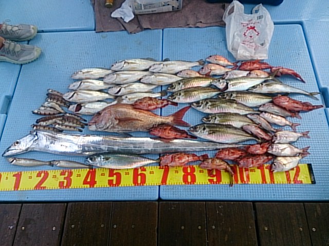 釣果 マダイ1匹・47センチ/タチウオ1匹・126センチ[タイカブラ]/マアジ8匹(32センチ〜38センチ)/マサバ1匹・35センチ/チャリコ12匹(16センチ〜20センチ)/ガシラ11匹(16センチ〜23センチ)/イシモチ10匹(25センチ〜30センチ)/キス2匹(19センチ・21センチ)/トラギス13匹(13センチ〜16センチ)