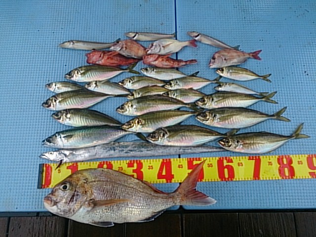 釣果 マダイ1匹・54センチ[タイカブラ]/マアジ18匹(20センチ〜35センチ)/マサバ1匹・37センチ・〜センチ)/チャリコ3匹(19センチ〜21センチ)/ガシラ2匹(20センチ・22センチ)/キス3匹(20センチ〜22センチ)/タチウオ1匹・82センチ[ジグ]