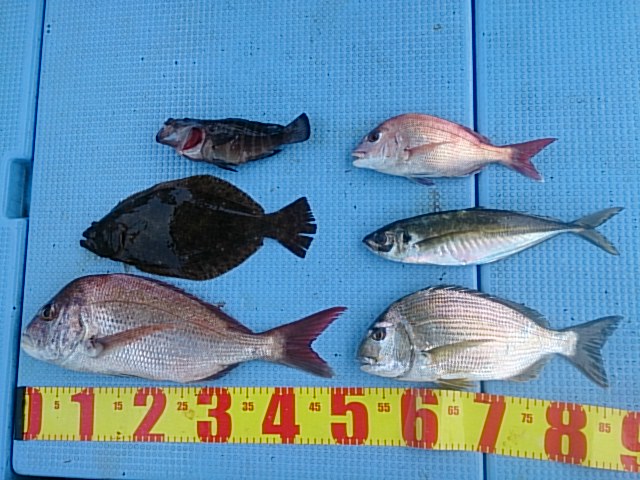 釣果 マダイ2匹(30センチ・52センチ)[ヒトツテンヤ]/ヘダイ1匹・37センチ[ヒトツテンヤ]/ヒラメ1匹・40センチ[ノマセ]/マハタ1匹・25センチ/マアジ1匹・37センチ