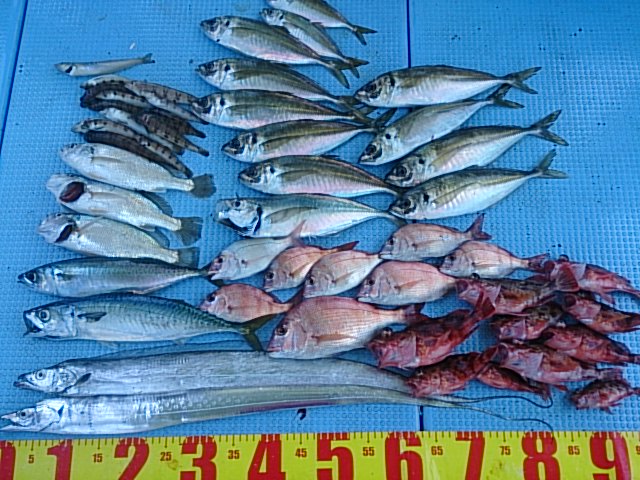 釣果 マアジ12匹(23センチ〜35センチ)/カスゴ1匹・28センチ/チャリコ7匹(17センチ〜22センチ)/ガシラ10匹(13センチ〜21センチ)/イシモチ3匹(26センチ〜28センチ)/キス1匹・18センチ/トラギス14匹(6センチ〜14センチ)/タチウオ2匹(83センチ・85センチ)
