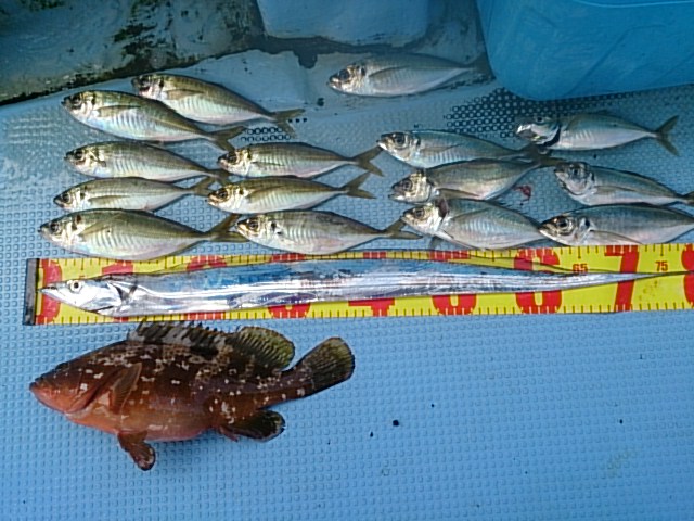 釣果 アコウ1匹・38センチ[ノマセ]/タチウオ1匹・88センチ/マアジ15匹(22センチ〜25センチ)/