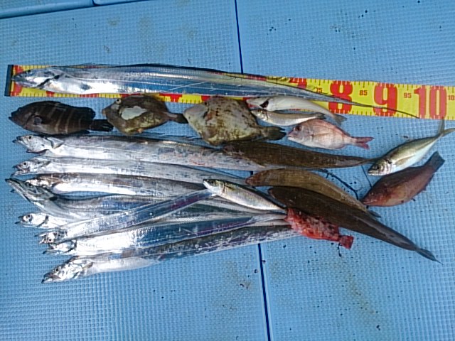 釣果 マタハ1匹・28センチ(ノマセ)/カワハギ2匹・25センチ/タチウオ数匹(60センチ〜98センチ)/マアジ数匹/チャリコ1匹・/ガシラ1匹・キス1匹・24センチ/エソ数匹