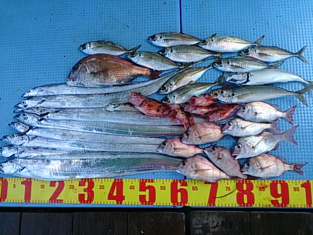 釣果 マダイ1匹・38センチ/タチウオ8匹(65センチ〜93センチ)/マアジ11匹(22センチ〜32センチ)/チャリコ8匹(18センチ〜22センチ)/ガシラ5匹(13センチ〜18センチ)/トラギス1匹・14センチ