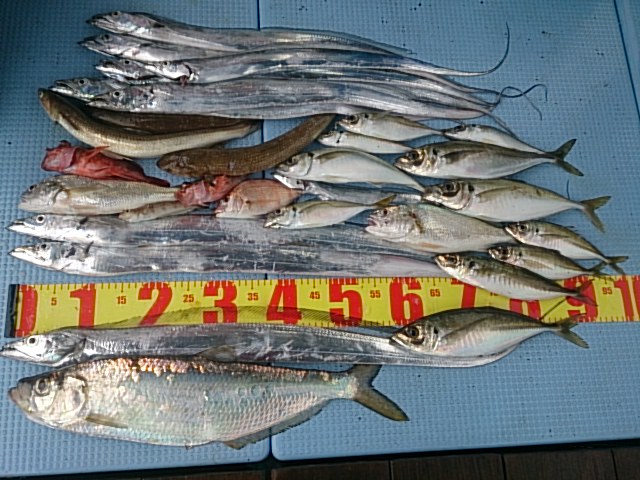 釣果 ヒラ1匹・63センチ/エソ3匹(32センチ〜45センチ)/タチウオ10匹(60センチ〜94センチ)/マアジ11匹(22センチ〜35センチ)/チャリコ1匹・19センチ/ガシラ2匹(15センチ・20センチ)/イシモチ2匹(30センチ・32センチ)/トラギス1匹・15センチ