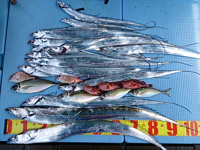釣果 タチウオ19匹(73センチ〜110センチ)/マアジ4匹(24センチ〜34センチ)/チャリコ匹(19センチ・20センチ)/ガシラ3匹(15センチ〜18センチ)