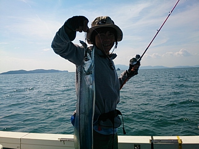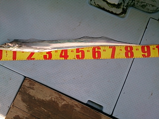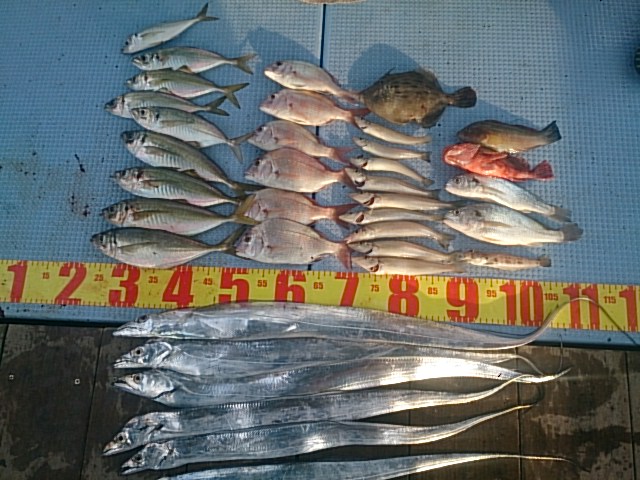 釣果 タチウオ6匹(75センチ~100センチ)/カワハギ匹・23センチ/マアジ9匹(21センチ~30センチ)/チャリコ6匹(20センチ~24センチ)/キス9匹(15センチ~22センチ)/ガシラ1匹・20センチ/トラギス1匹・15センチ/イシモチ2匹(23センチ・25センチ)