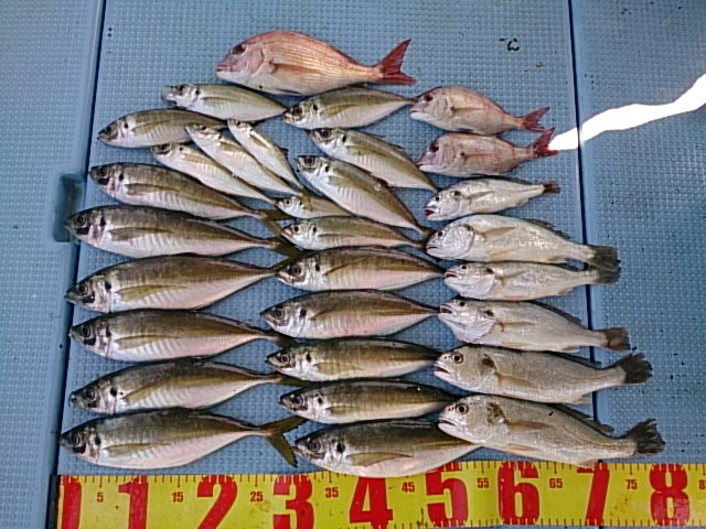 釣果 マダイ1匹・32センチ/マアジ21匹(20センチ~36センチ)/チャリコ2匹(21センチ・22センチ)/イシモチ6匹(20センチ~32センチ)