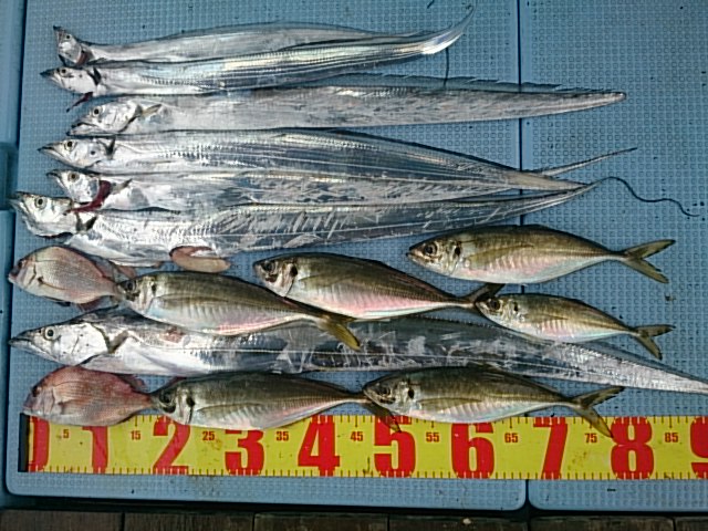 釣果 タチウオ7匹(70センチ~118センチ)/マアジ6匹(25センチ~35センチ)/チャリコ2匹(21センチ・24センチ)