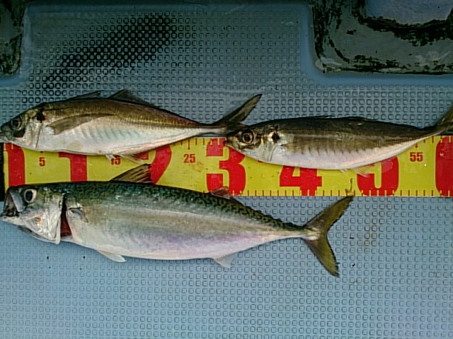 釣果 マサバ1匹・48センチ[高仕掛け]/マアジ2匹(34センチ・36センチ)[高仕掛け][タイカブラ]/チャリコ2匹(24センチ・25センチ)[タイカブラ]