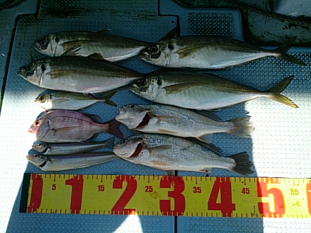 厳しい1日でしたが何とか良型マアジの顔見ること出来ました 。 2014年10月29日 今日も、風波強い1日でした。 タチウオ、五目、タイカブラ、インチク好きな事して遊んでもらいましたが、厳しかったです(>__<) また、釣りしに来て下さいね(^^) 本日は何もかも悪い中、ありがとうございました。