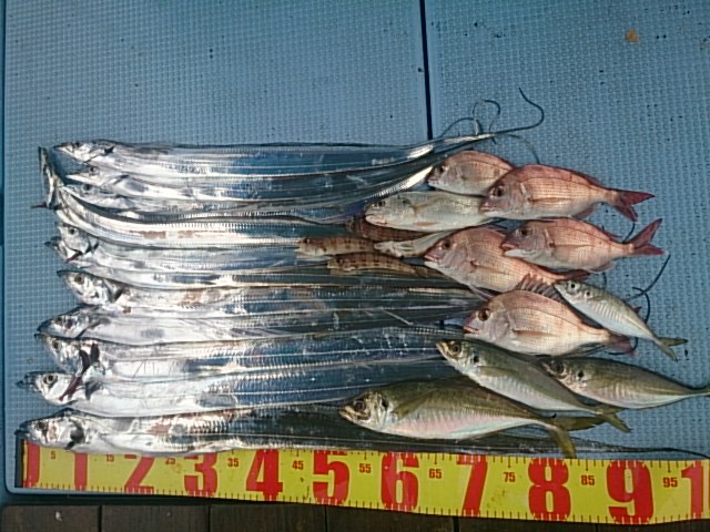 釣果 タチウオ12匹(73センチ~106センチ)/マダイ匹・センチ/マアジ4匹(27センチ~36センチ)/チャリコ5匹(17センチ~24センチ)/イシモチ1匹・25センチ/トラギス4匹(14センチ~16センチ)