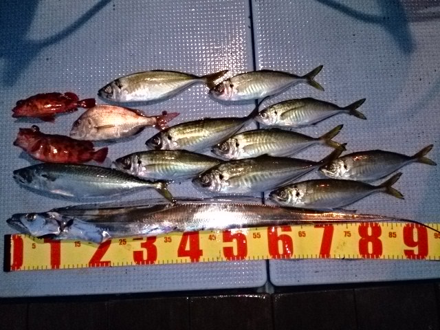 釣果 タチウオ1匹・101センチ/マサバ1匹・39センチ/マアジ9匹(27センチ~39センチ)/カスゴ1匹・25センチ/ガシラ2匹(19センチ・22センチ)