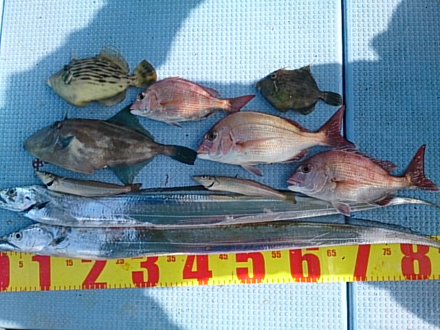 釣果 タチウオ2匹(103センチ・108センチ)/カスゴ3匹(23センチ~32センチ)/ウマヅラハギ1匹・35センチ/カワハギ2匹(18センチ・23センチ)/キス2匹(20センチ・21センチ)