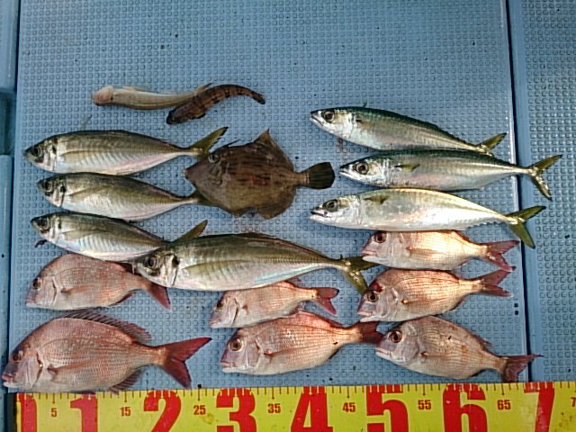 釣果 カワハギ1匹・22センチ/マサバ3匹(28センチ~32センチ)/マアジ4匹(26センチ~36センチ)/チャリコ6匹(19センチ~23センチ)/カスゴ1匹・28センチ/トラギス1匹・15センチ