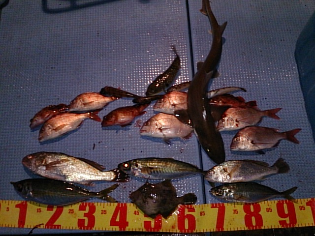 釣果 マアジ3匹(26センチ~35センチ)/カワハギ1匹・20センチ/チャリコ5匹(20センチ~26センチ)/イシモチ2匹(26センチ・35センチ)/ガシラ3匹(17センチ~19センチ)//トラギス4匹(13センチ~16センチ)