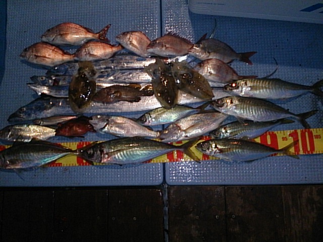 釣果 アコウ1匹・20センチ[タイカブラ]/コウイカ3杯(胴長13センチ~15センチ)/タチウオ4匹(80センチ~110センチ)/マアジ7匹(26センチ~40センチ)/チャリコ7匹(20センチ~24センチ)/イシモチ3匹(25センチ~28センチ)/ガシラ1匹・20センチ/キス1匹・16センチ