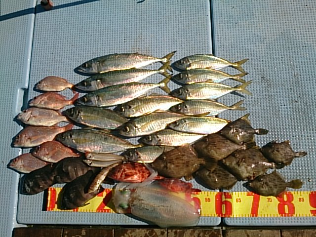 釣果 アオリイカ1杯・胴長25センチ/サンバソウ3匹(19センチ~22センチ)/マアジ11匹(26センチ~38センチ)/マサバ3匹(37センチ~38センチ)/カワハギ7匹(15センチ~23センチ)/チャリコ5匹(21センチ~24センチ)/ガシラ1匹(15センチ・23センチ)/キス1匹・18センチ/トラギス1匹・16センチ