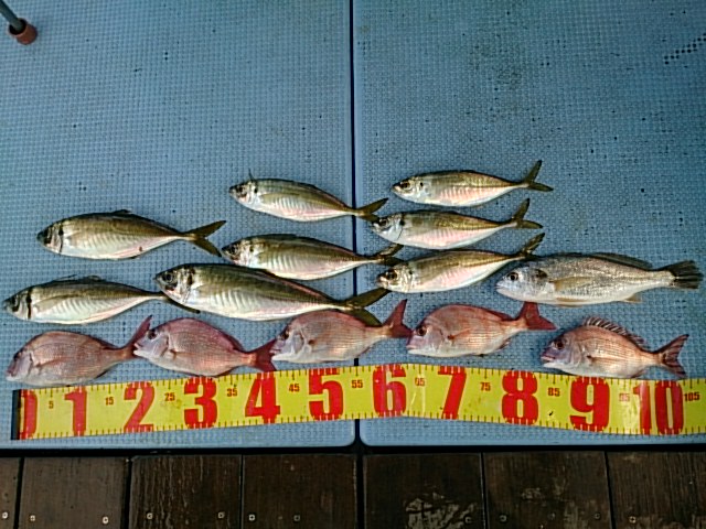 釣果 マアジ8匹(25センチ~40センチ)/チャリコ5匹(22センチ~27センチ)/イシモ1匹・32センチ