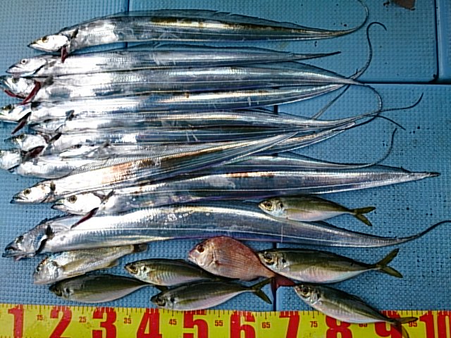 釣果 タチウオ11匹(68センチ~118センチ)/マアジ6匹(25センチ~32センチ)/チャリコ1匹・24センチ/イシモチ1匹・27センチ