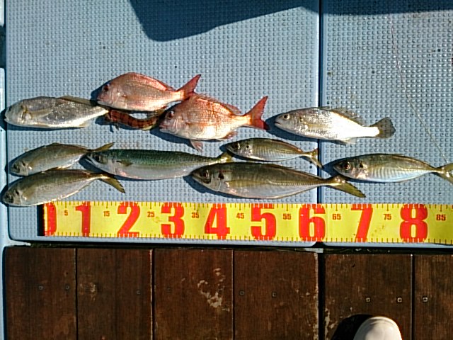 釣果 マアジ5匹(21センチ~38センチ)/マサバ1匹・36センチ・チャリコ2匹(23センチ・24センチ)/イシモチ2匹(24センチ・28センチ)/トラギス1匹・16センチ