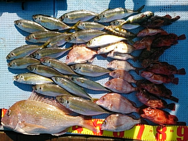 釣果 マダイ1匹・55センチ[高仕掛け]/マアジ20匹(20センチ~36センチ)/マサバ2匹(25センチ・27センチ)/チャリコ9匹(16センチ~25センチ)/ガシラ5匹(15センチ~22センチ)/トラギス2匹(14センチ・15センチ)