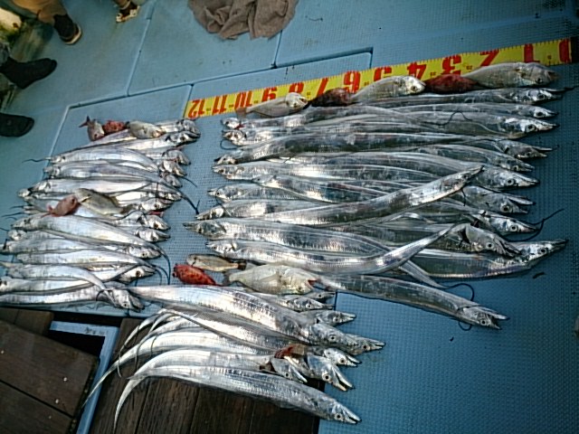 釣果 タチウオ56匹(80センチ~110センチ)/チャリコ2匹(22センチ・23センチ)/イシモチ7匹(23センチ~32センチ)/ガシラ4匹(18センチ~20センチ)