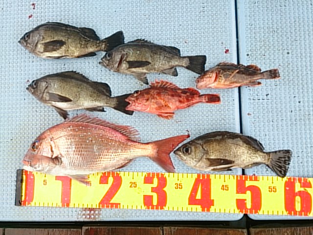 釣果 マダイ1匹・37センチ[鯛カブラ]/メバル4匹(25センチ~26センチ)/ガシラ2匹(18センチ・20センチ)[ヒトツテンヤ]