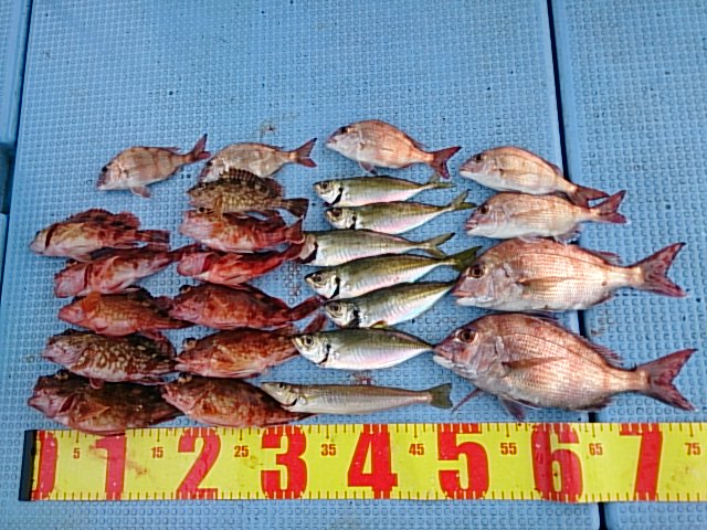 釣果 マアジ6匹(19センチ~22センチ)/キス1匹・22センチ/ガシラ11匹(12センチ~22センチ)/カスゴ2匹(25センチ・29センチ)/チャリコ5匹(15センチ~20センチ)