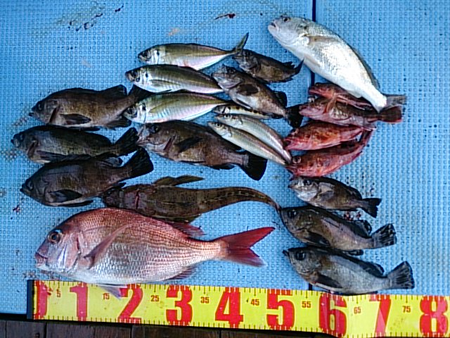 釣果 マダイ1匹・49センチ[タイカブラ]/メバル9匹(19センチ~28センチ)/マアジ3匹(25センチ~28センチ)/ガシラ3匹(15センチ~20センチ)/キス匹(20センチ・22センチ)/鰐鯒1匹・42センチ/トラギス1匹・13センチ/イシモチ1匹・32センチ