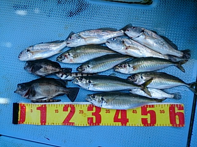 釣果 メバル2匹(19センチ・26センチ)/マアジ6匹(27センチ~32センチ)/イシモチ4匹(17センチ~28センチ)/トラギス2匹(12センチ・18センチ)