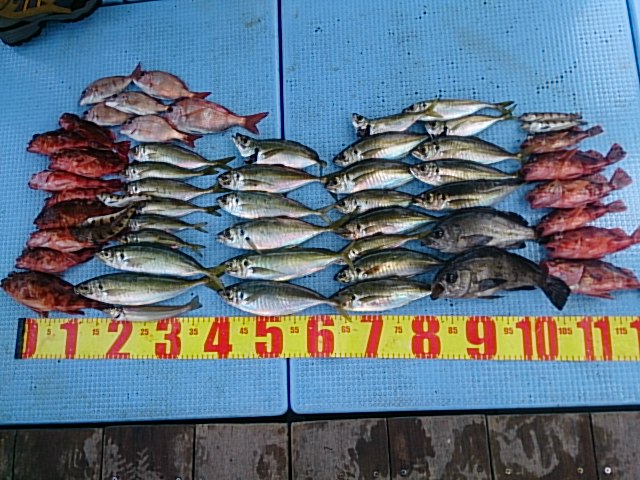 釣果 メバル2匹(28センチ・30センチ)/マアジ27匹(20センチ~33センチ)/キス1匹・20センチ/ガシラ15匹(センチ~24センチ)/チャリコ6匹(17センチ~23センチ)/トラギス5匹(10センチ~17センチ)
