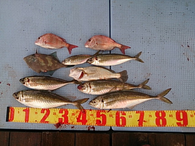 釣果 マアジ6匹(23センチ~45センチ)/ウマヅラハギ1匹・30センチ/チャリコ2匹(24センチ・25センチ)/イシモチ1匹・31センチ