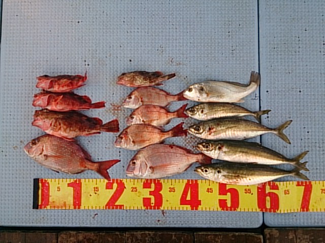 釣果 マアジ&マルアジ4匹(23センチ~32センチ)/ガシラ4匹(16センチ~23センチ)/カスゴ2匹(25センチ・26センチ)/チャリコ3匹(18センチ~20センチ)/イシモチ1匹・23センチ