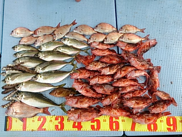 釣果 アコウ1匹・20センチ[胴付き3本針仕掛けの青イソメ]/マアジ12匹(23センチ~35センチ)/ガシラ30匹(17センチ~25センチ)/カスゴ1匹・28センチ/チャリコ12匹(16センチ~19センチ)/トラギス11匹(10センチ~16センチ)