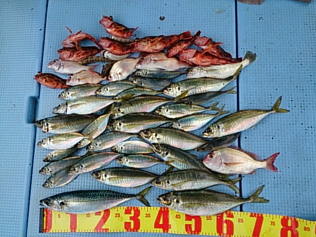 釣果 サバ匹・40センチ/マアジ29匹(22センチ~36センチ)/ガシラ9匹(15センチ~22センチ)/カスゴ1匹・28センチ/チャリコ3匹(18センチ~20センチ)/トラギス4匹(12センチ~15センチ)/イシモチ1匹・27センチ