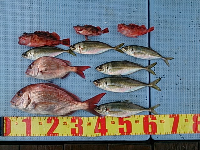 釣果 マダイ1匹・41センチ/マアジ6匹(23センチ~29センチ)/ガシラ3匹(15センチ~21センチ)/カスゴ1匹・27センチ